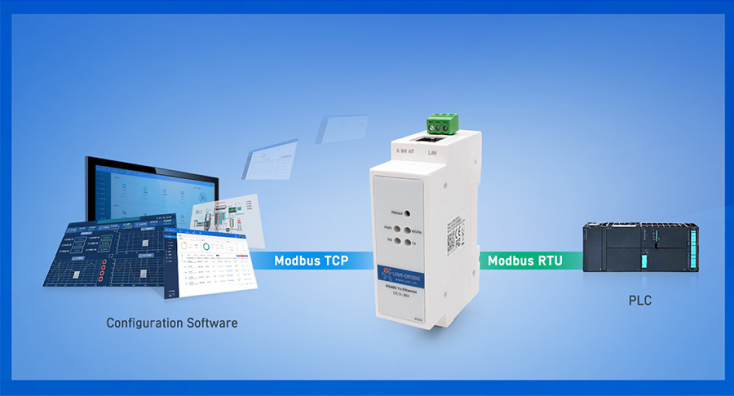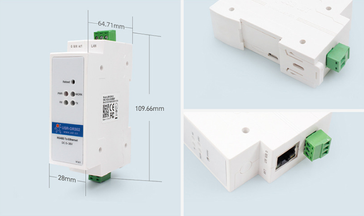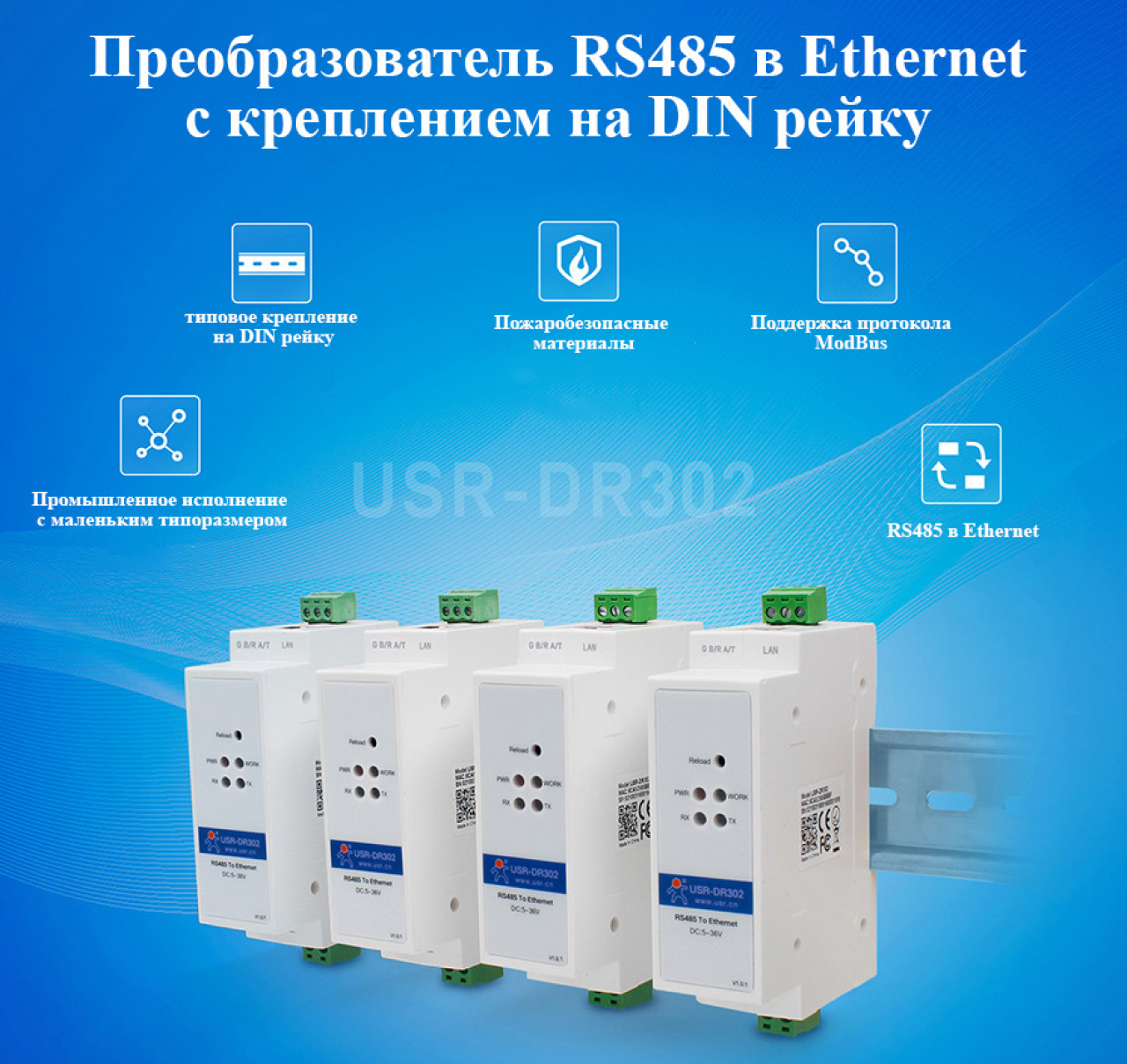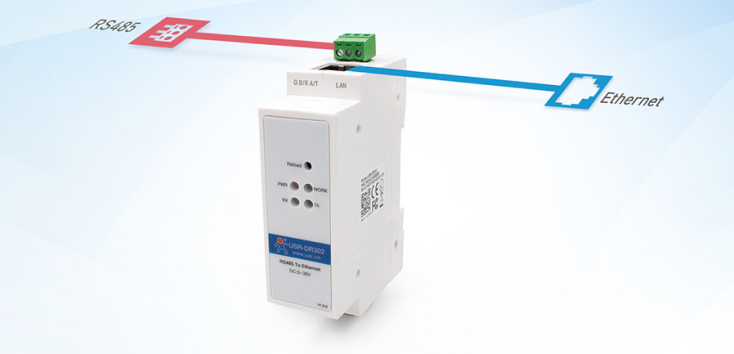 USR-DR302 - это малогабаритный преобразователь RS485 в Ethernet с поддержкой протокола ModBus, в корпусе для установки на DIN рейку, содержит функции двусторонней прозрачной передачи RS485 в Ethernet.