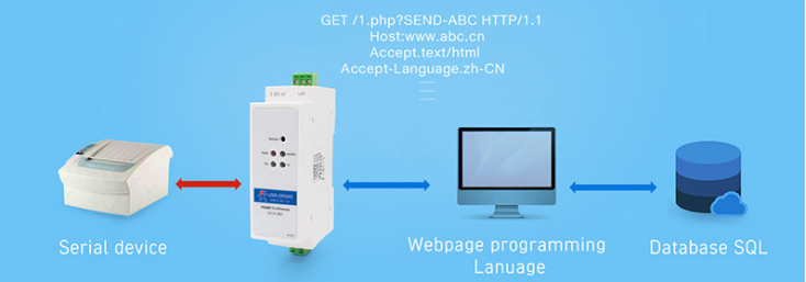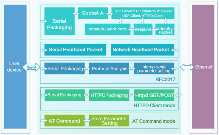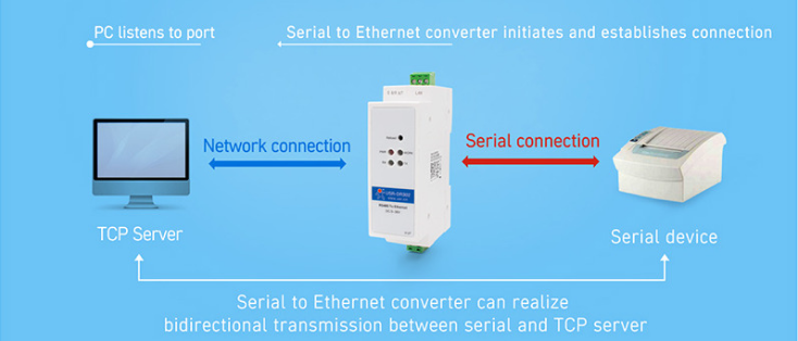 Преобразователь последовательного порта в Ethernet USR-DR302 контролирует установленный порт и ожидает соединения TCP-клиента. Данные с последовательного устройства будут переданы всем успешно подключенным клиентам через Ethernet.