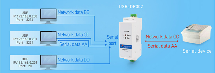 USR-DR302 может автоматически передавать данные на последнее переданное устройство после получения данных, что подходит для много потоковых устройств, которым необходимо обмениваться данными с USR-DR302.